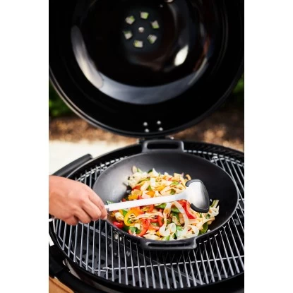 Der Rösle BBQ Pfannen- und Woklöffel misst 40 cm und besitzt einen rundumlaufenden Silikonrand zum schonenden Heben, Wenden, Verschieben und Herausschöpfen von Speisen aus dem Wok. Der Rand verhindert Kratzer und Beschädigungen am Wok. Die Lebensmittel werden einfach vom Rand und Boden abgeschabt, damit nichts anhaftet. Der Rundgriff aus hochwertigem Edelstahl liegt perfekt in der Hand und verfügt über eine praktische Öse zum Aufhängen des Löffels.